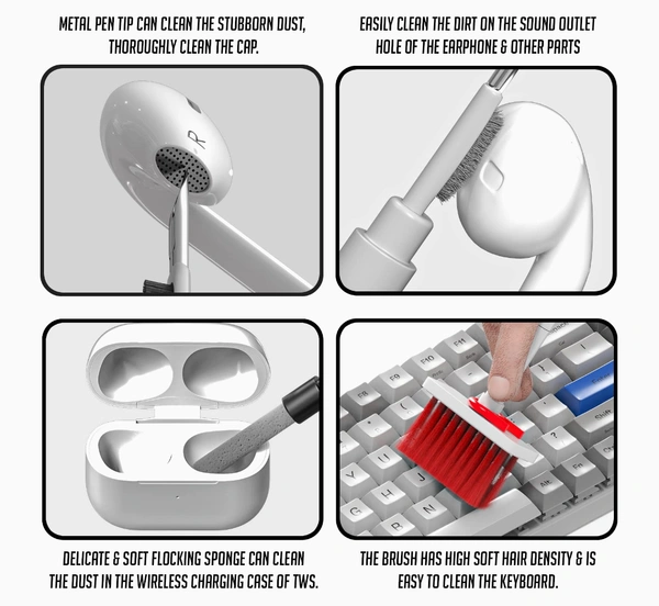 - MULTIFUNCTIONAL CLEANING KIT: Flocking Sponge can Clean the Dust In the Wireless Charging Case of the Earphone. High-density Brush can Clean the Dirt on the Sound Outlet Hole of the Earphone. Metal Pen Tip Can Clean the Stubborn Dust.
