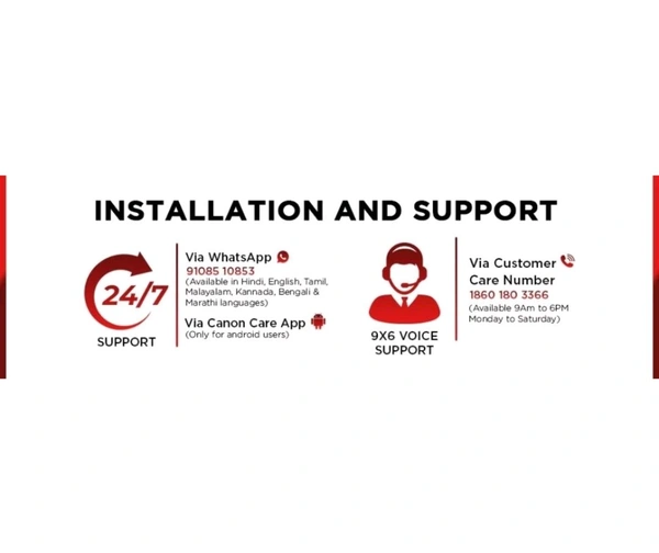 - Warranty - 1 Year or 15000 prints (whichever is earlier) onsite warranty from the date of purchase. Warranty applicable on manufacturing defects only. Free one time installation support from Canon. Use only original Canon ink. Using counterfeit ink will harm your printer as well as render your warranty void