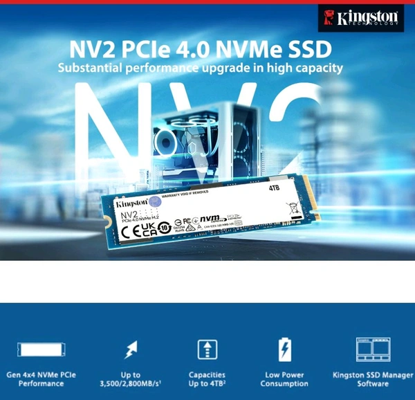 - Kingston's NV2 PCIe 4.0 NVMe SSD is a substantial next-gen storage solution powered by a Gen 4x4 NVMe controller.