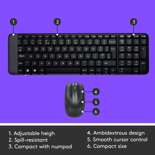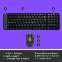 - The Logitech Combo MK220 Wireless Keyboard is compact and designed to take less space on your desktop. The smaller size does not come at the expense of comfort as all the keys that are present on a regular keyboard are available. You can easily switch from your normal keyboard to this wireless gadget without having to struggle with a steep learning curve. The minimalist design helps you type faster as the space between the keys are reduced, which in turn reduces the distance your fingers have to travel while typing.