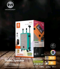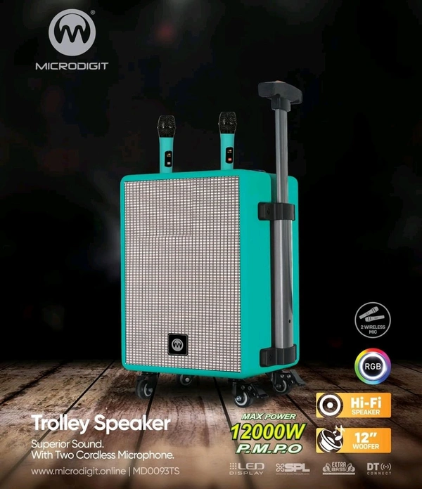- The all new MicrodigitⓇ Trolley Speaker with advanced features will gives you a unforgettable music experience. When you're looking for a rugged, take-anywhere speaker for the beach or a multi-room sound system, this product will be fulfill all your needs. It has 12 Inch Woofer, FM, USB function. Product include Two Wireless Microphone as well, which you can use for singing.