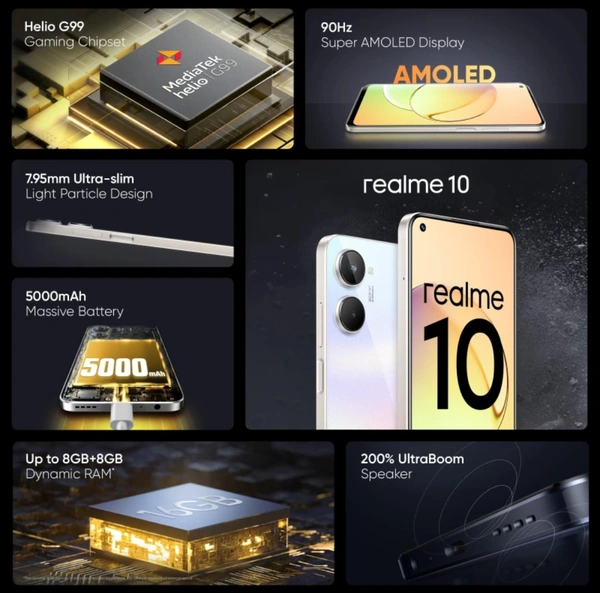 - With a 90 Hz Super AMOLED display, the Realme 10's 16.25 cm (6.4) FHD+ screen, 90.8% Screen-to-Body Ratio, Corning Gorilla Glass 5 for added safety, 1000 nits of peak brightness for brilliance, and a contrast ratio of 4000000:1 that makes every image spectacular, you can experience incredible visuals. Additionally, the 4096-level brightness adjustment and 90 Hz refresh rate create a fluid visual experience and enhance the delicacy of both images and text.