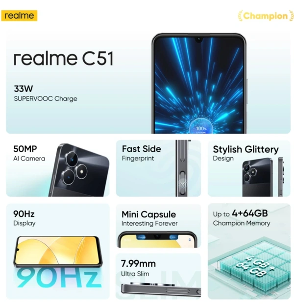 - [Processor] - UNISOC T612 Octa-Core 12nm processor with Mali-G57 GPU || The realme C51 is powered by the Unisoc T612 chipset, an octa-core processor paired with 4GB of RAM. This combination provides sufficient performance for everyday tasks, such as web browsing, social media usage, and gaming.lt performs admirably for daily use.