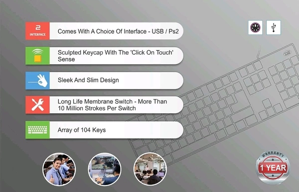 - Matte Surface, Ergonomic Design, Compact Size, Soft Touch Keys, Laser Printed keys, High Quality internal Key membrane