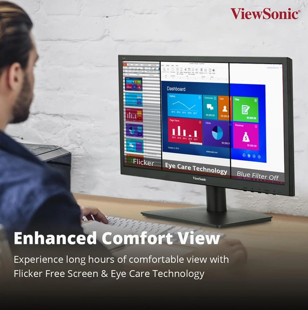 - Featuring a hairline surface finish, this monitor looks great on any desktop. ViewSonic's exclusive ViewMode™ feature provides intuitive presets for optimised screen performance in different applications. In addition, Flicker-Free technology and a Blue Light Filter help to eliminate eyestrain from extended viewing periods for improved productivity.